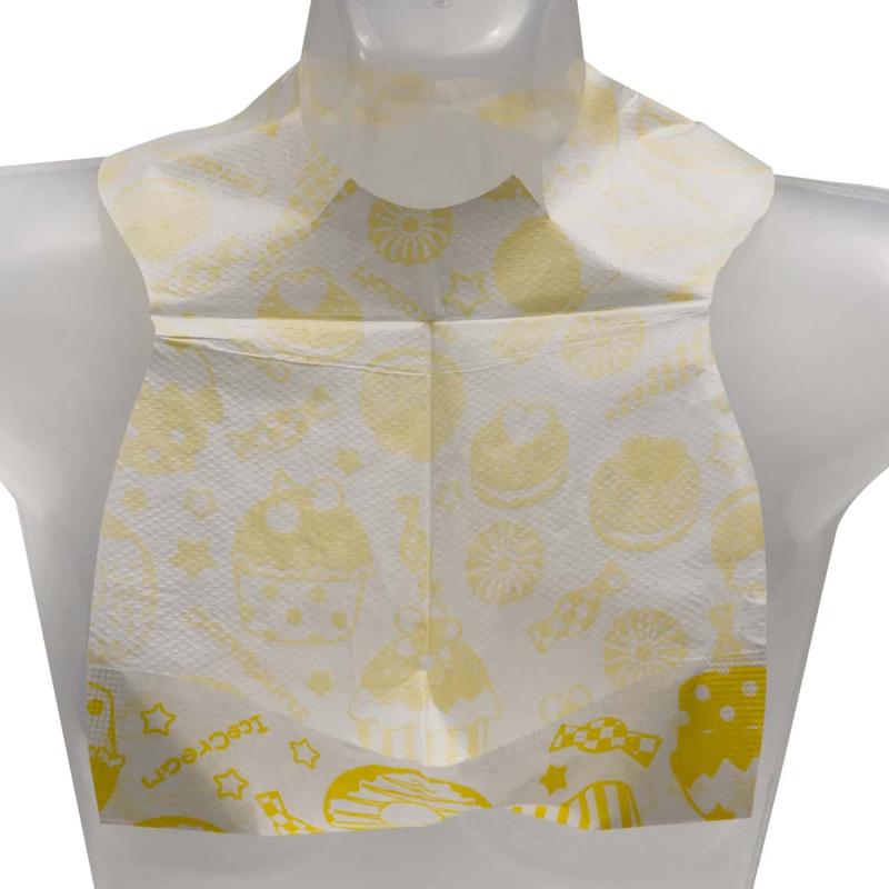 Tablier jetable pour bébé avec pochette en papier, en matériau PE, imperméable, imprimable avec de multiples motifs.